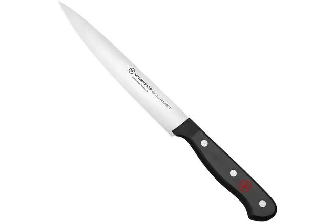 The Wüsthof Gourmet filleting knife is enhanced with a flexible, slim 16 cm blade, and is great when filleting most types of meat. Chicken or duck for instance, or spare ribs. The blade is thick enough to handle these types of tasks. Please note: you cannot cut through bone with this knife.