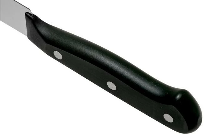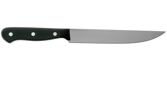 This Wüsthof Gourmet kitchen knife 18 cm is perfect when cutting meat, vegetables and fruit. In comparison to a chef’s knife this kitchen knife is enhanced with a narrower and less high blade. As such the knife is a little more compact and flexibe as you use it.