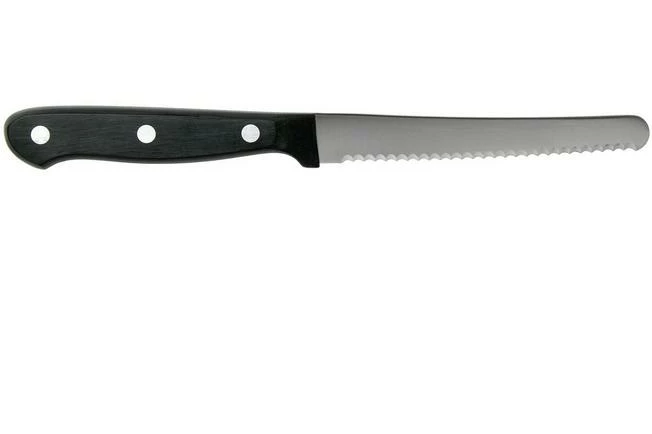 This Wüsthof Gourmet tomato knife 12 cm is not just meant for cutting tomatoes. It is the perfect companion when preparing lunch or brunch. Because of the fine serrations this knife will not only nicely cut through loaves of bread without tearing it, it can also handle other vegetables, fruit or dry sausages. As such this knife is perfect for every lunch/brunch.