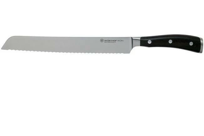 The Wüsthof Ikon double serrated bread knife 23 cm is a bread knife with a luxurious look and feel. Because of the double serrations the knife will quickly and effectively cut through all types of bread. From hard to soft crusts, from soft buns to baguettes. This all-round knife, however, can also cut through delicious pies or a large piece of celeriac.