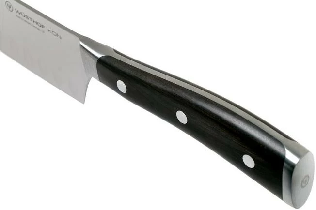 The Wüsthof Ikon Santoku 17 cm is a versatile kitchen knife with a luxurious look and feel. Perfect when cutting, crushing and scooping meat, fish or vegetables and also amazing to look at. The blade is enhanced with dimples. As such vegetables and potatoes won’t stick to the blade.