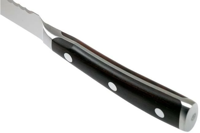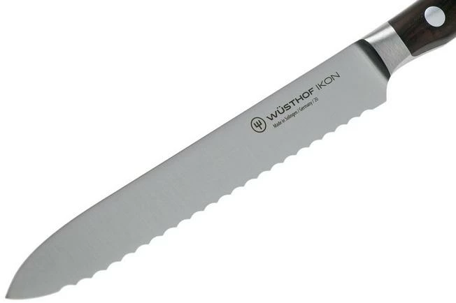 The Wüsthof Ikon sausage knife 14 cm is, as the name might already suggest, perfect when cutting sausage. Because of the serrated blade you can easily cut through the hard outside of a sausage. This knife, however, is also great when cutting tomatoes, baguettes, melon or squash.