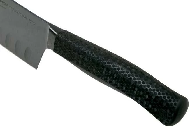 This Wüsthof Performer Santoku with dimples 17 cm is a real all-rounder in the kitchen. The Santoku is the Japanese chef’s knife, named after the three tasks in the kitchen: slicing, dicing and chopping. A santoku is perfect when preparing meat, fish and vegetables. Because the blade is enhanced with dimples little air bubbles emerge. This prevents the food from sticking to the blade.