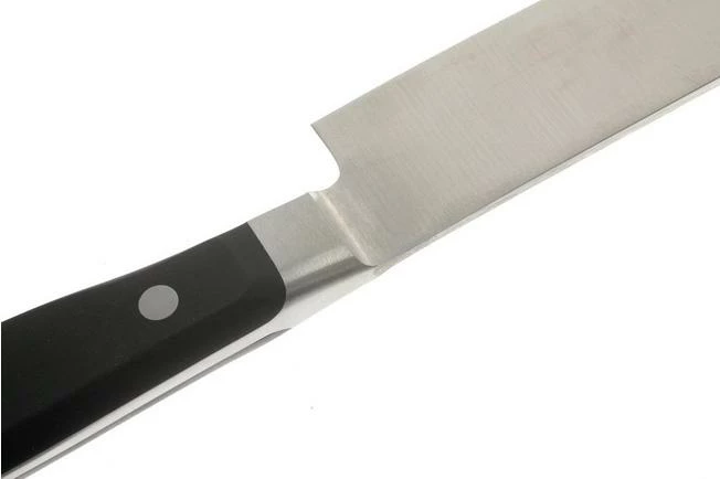 As German knives manufacturer Wüsthof has ventured to making a typical Japanese knife: the Yanagiba. Yanagiba is Japanese for ‘ Willow leaf ‘. This knife is designed for cutting fish and sushi. The long blade cuts fast through large pieces of fish. The blade has one straight and one hypotenuse. The unilateral cut is usually only applied to Japanese knives, but now also by Wusthof. With this knife you cut almost perpendicular to the cutting board. After a bit of practice, you can cut paper-thin slices.