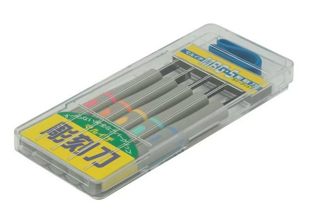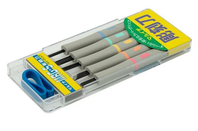 The Yoshiharu MRG-5 Maruichi set is a set of Japanese gouges. These gouges have a longer handle, so you can hold them like a pencil and work really precisely with them. They are typical, traditional Japanese gouges, made for making wood engravings. But they are also suitable for other forms of woodworking. This set comes in a sturdy plastic case. The case also contains an elastic that you can use to close the case firmly. The elastic is a bit tough at first, but it gets easier with use.