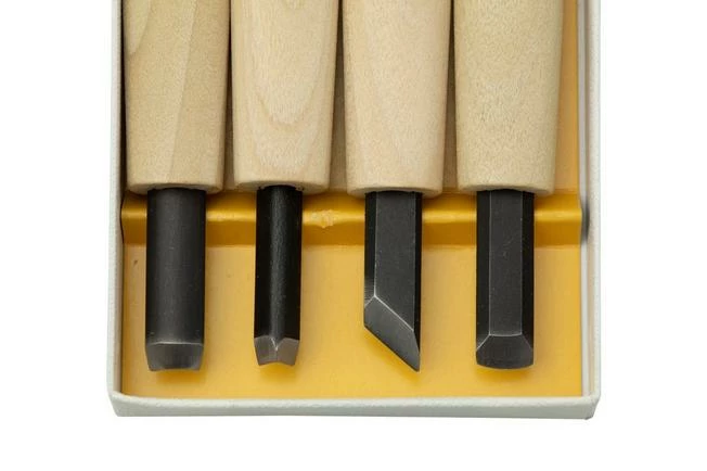 The Yoshiharu Y-4 Mitomoto set is a set of Japanese gouges. These gouges have a longer handle, so you can hold them like a pencil and work really precisely with them. They are typical, traditional Japanese gouges, made for making wood engravings. But they are also suitable for other forms of woodworking.