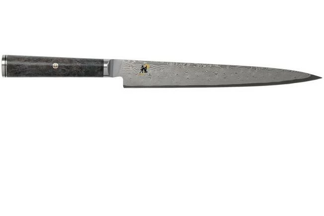 The Zwilling Miyabi 5000MCD 67 sujihiki 24 cm is a Japanese carving knife. With the long, narrow 24 cm blade you can cut meat and fish into wafer-thin slices.
