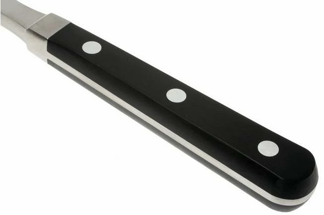 The kitchen knives of the Pro series by Zwilling have a blade that is forged from 1 piece of steel. The blade runs entirely in the plastic handle: a ‘ full tang ‘ construction. The handle is attached to the steel with 3 rivets. The transition between handle and metal is seamless. This means no crack which collects dirt. These knives have a classic design and are particularly attractive to those who love a heavier type of knife.