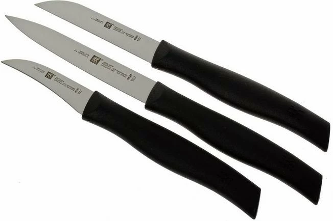 This Zwilling Twin Grip three-piece peeling knife set is incredibly practical for daily use. The relatively light-weight knives are made from top-quality materials. The plastic handles are ergonomically shaped and seamlessly merge with the blade. As such bacteria cannot accumulate underneath the handle, making these knives incredibly hygienic.